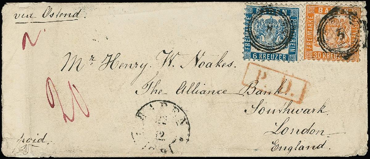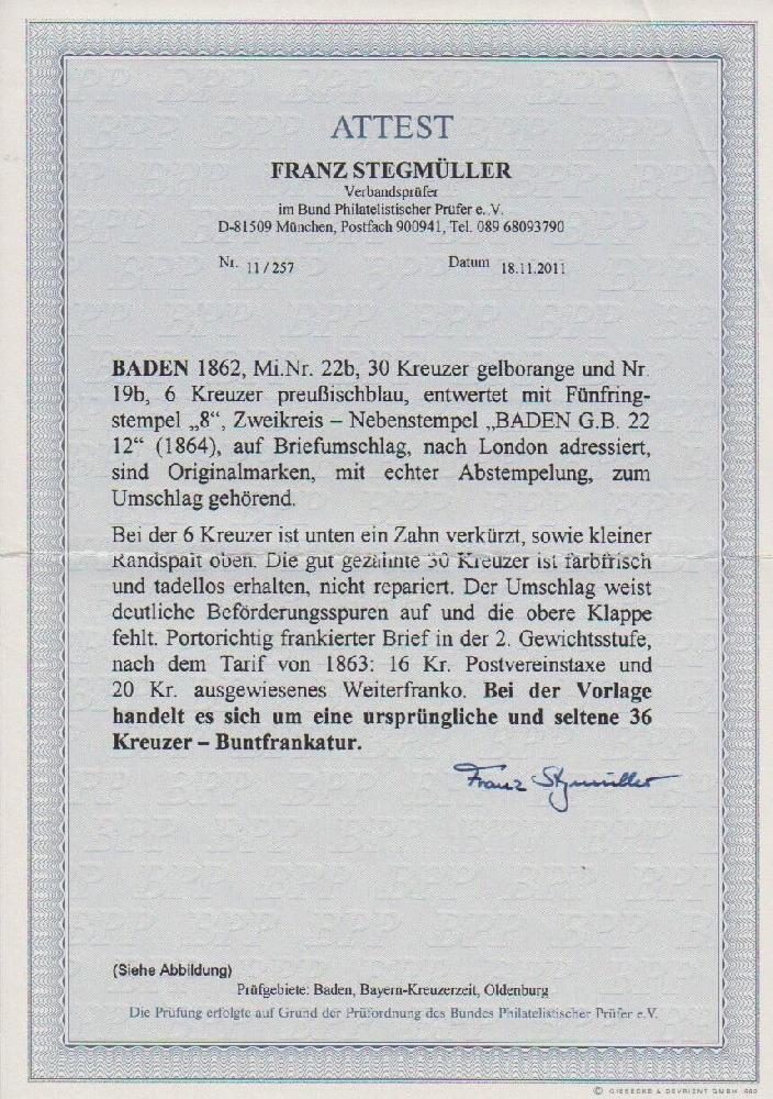 | Zusatzinformationen und Suchstichworte: | Rauhut & Kruschel - 213. Auktion 16. - 17. September 2022 Los 28 Altdeutschland Baden 30 Kr. gelborange, tadellos, nebst 6 Kr. preußischblau (ein kurzer Zahn bzw. kleiner Randspalt) auf Damencouvert (dieses deutliche Beförderungsspuren) von Baden (K2 und NS "8") nach London. Attest Stegmüller: "ursprüngliche und seltene 36-Kreuzer-Buntfrankatur". Mi. 10.000,- Zuschlag 1.000,00 EUR |