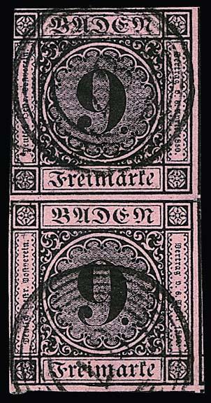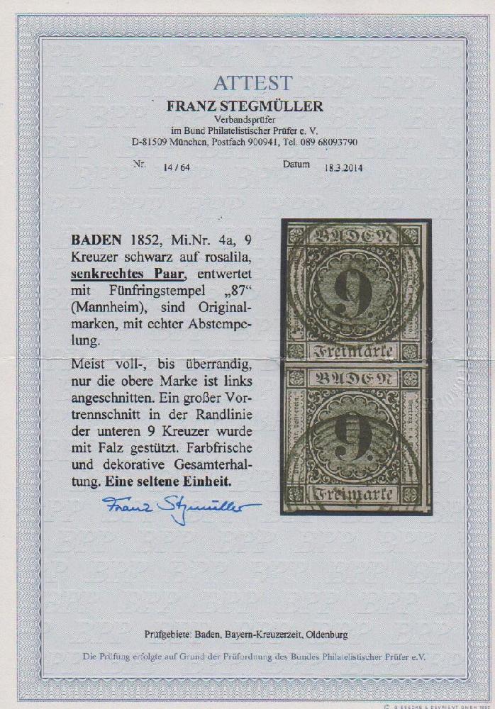| Zusatzinformationen und Suchstichworte: | Rauhut & Kruschel - 213. Auktion 16. - 17. September 2022 Los 543 Altdeutschland Baden 9 Kr. schw./altrosa, seltenes gestempeltes senkrechtes Paar mit NS "87" (Mannheim). Obere Marke links angeschnitten, untere Vortrennschnitt in der Randlinie, Attest Stegmüller "dekorative Gesamterhaltung. Eine seltene Einheit". Mi. 2000,- Ausruf 350,00 EUR |