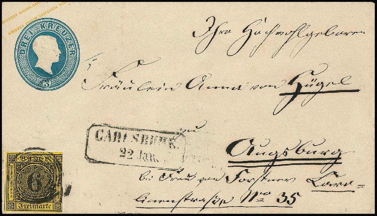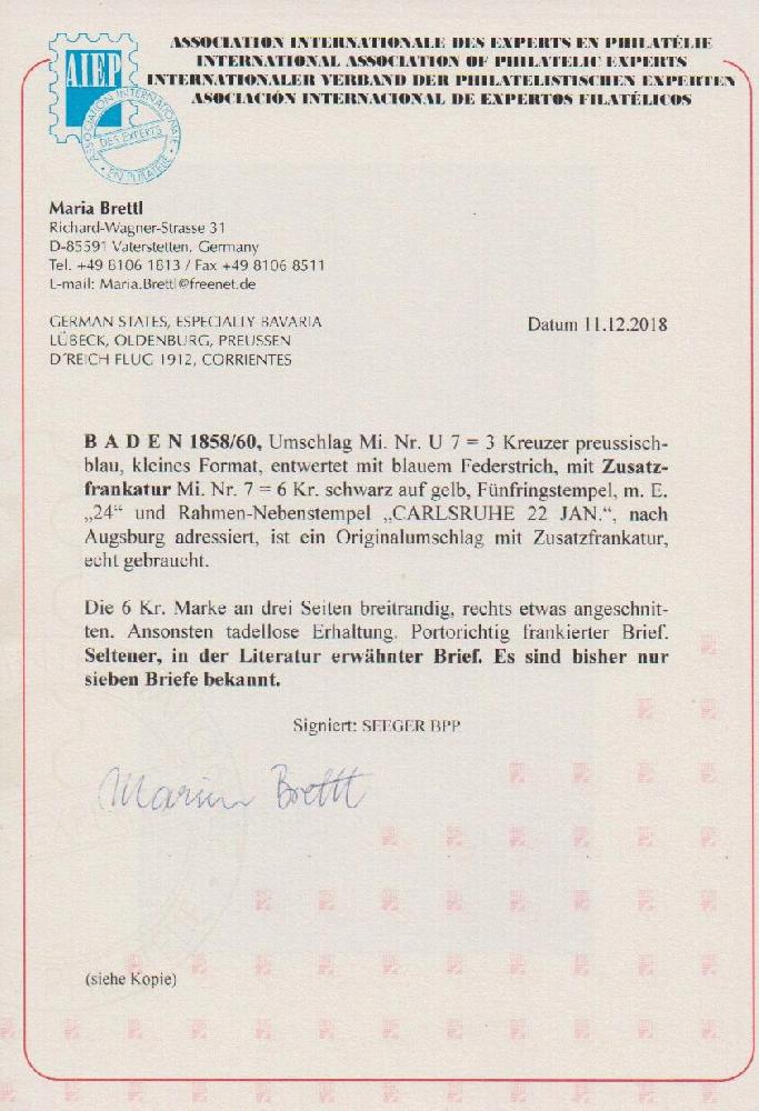 | Zusatzinformationen und Suchstichworte: | Rauhut & Kruschel - 213. Auktion 16. - 17. September 2022 Los 563 Altdeutschland Baden 6 Kr. schw./orangegelb, drei Seiten voll- bis breitrandig, auf Ganzsache 3 Kr. preußischblau, mit Ra2 "Carlsruhe" als Postvereinsbrief nach Augsburg. Nur wenige Ganzstücke mit dieser Kombination bekannt. Sign. Seeger und Attest Brettl: "Seltener, in der Literatur erwähnter Brief." Ausruf 300,00 EUR |