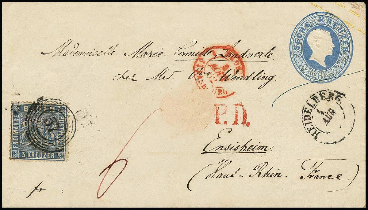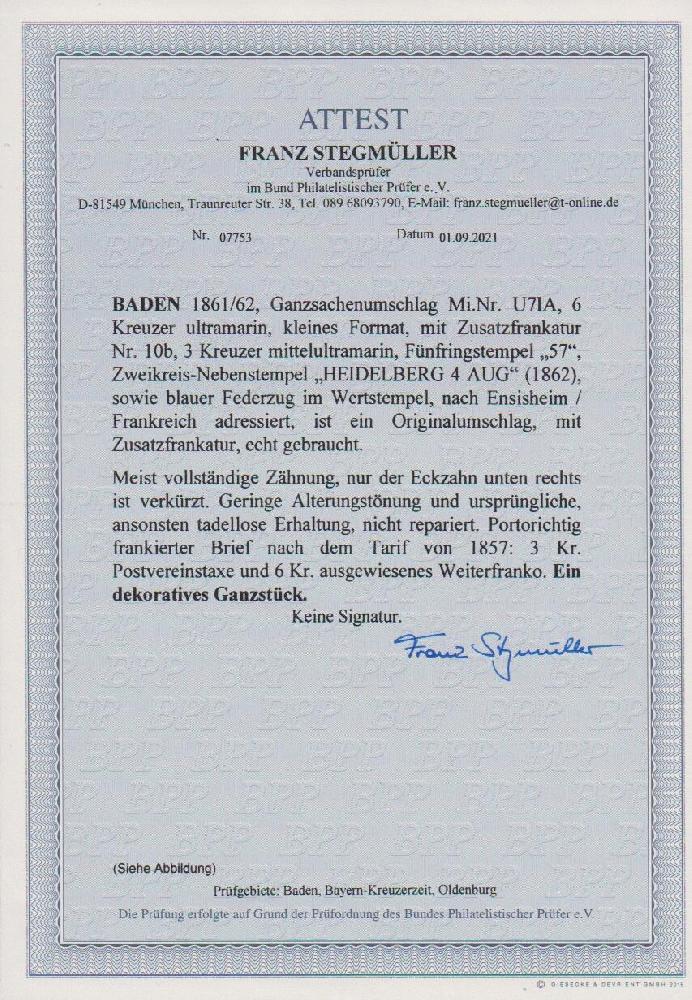 | Zusatzinformationen und Suchstichworte: | Rauhut & Kruschel - 213. Auktion 16. - 17. September 2022 Los 575 Altdeutschland Baden 3 Kr. ultramarin (ein minimal verkürzter Eckzahn) auf Ganzsache 6 Kr. blau, von Heidelberg 1862 nach Ensisheim/Frankreich, ursprüngliche Erhaltung, 3 Kr. Postverein plus 6 Kr. Weiterfranko, seltene Kombination! Attest Stegmüller Ausruf 500,00 EUR |
