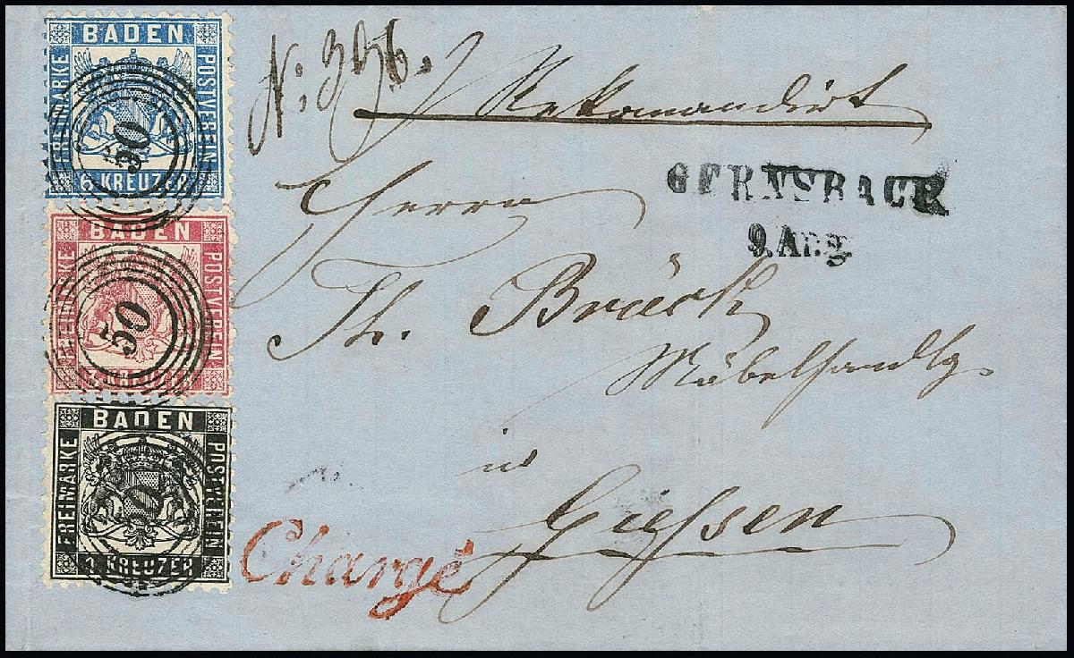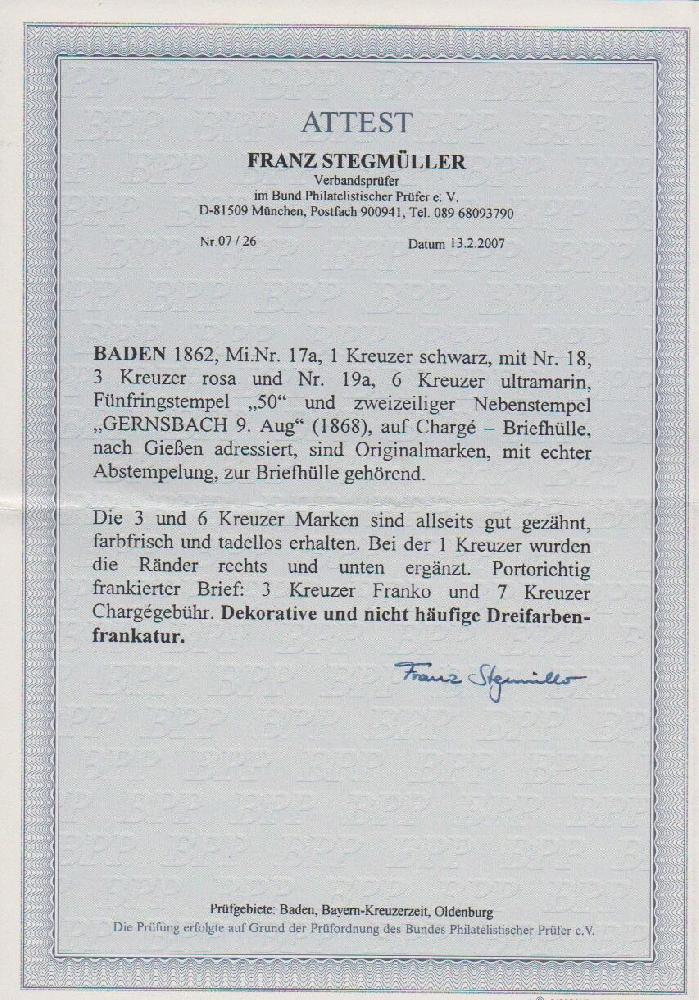 | Zusatzinformationen und Suchstichworte: | Rauhut & Kruschel - 213. Auktion 16. - 17. September 2022 Los 602 Altdeutschland Baden 1 Kr. schwarz, 3 Kr. rosa und 6 Kr. ultramarin auf dekorativem Einschreibebrief mit klaren NS "50" und L2 "Gernsbach", bei der 1 Kr. rechts und unten Ergänzungen, sonst tadellos und in dieser Form nicht häufige Frankatur-Kombination! Attest Stegmüller Zuschlag 300,00 EUR |