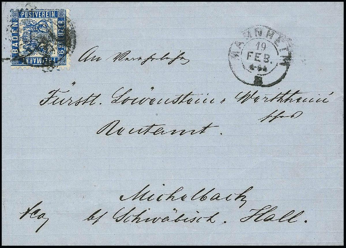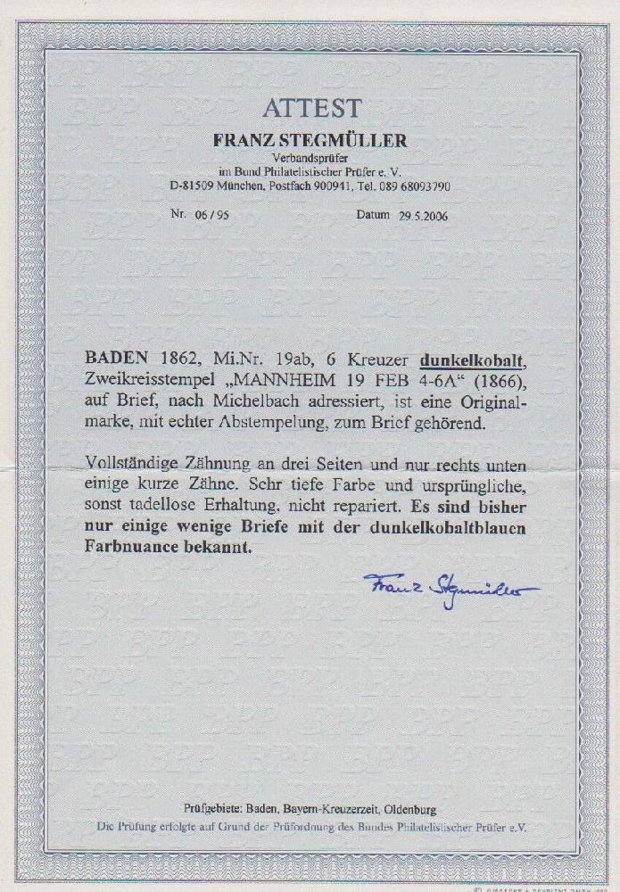 | Zusatzinformationen und Suchstichworte: | Rauhut & Kruschel - 213. Auktion 16. - 17. September 2022 Los 611 Altdeutschland Baden 6 Kr. dunkelkobalt, weitgehend vollzähnig, rechts zwei kurze Zähne, einzeln auf Faltbrief aus Mannheim. Die Nr. 19ab ist auf Ganzstück so selten, dass sie im Michel überhaupt nicht bewertet wird! Attest Stegmüller "nur einige wenige Briefe ... bekannt" Ausruf 500,00 EUR |