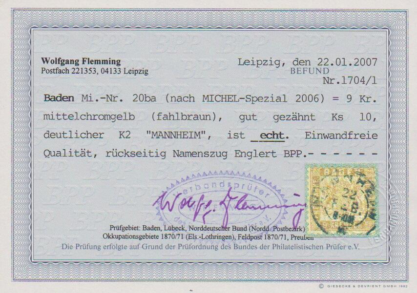 | Zusatzinformationen und Suchstichworte: | Rauhut & Kruschel - 213. Auktion 16. - 17. September 2022 Los 616 Altdeutschland Baden 9 Kr. gelb- und fahlbraun, je zentr. gest. Kabinettstücke, sign. Englert bzw. eine Fotoexp. Flemming. Mi. 160,- Ausruf 40,00 EUR |