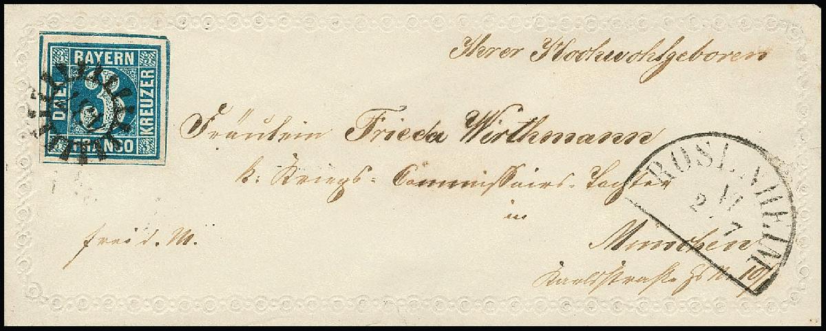 | Zusatzinformationen und Suchstichworte: | Rauhut & Kruschel - 213. Auktion 16. - 17. September 2022 Los 32 Altdeutschland Bayern 3 Kr. blau, Pl. 5, breitrandig mit vier Seiten Schnittlinien, Kabinettstück auf hübschem Präge-Ziercouvert mit gMR "437" und HK "Rosenheim", Fotoexp. Brettl Zuschlag 320,00 EUR |