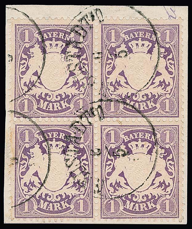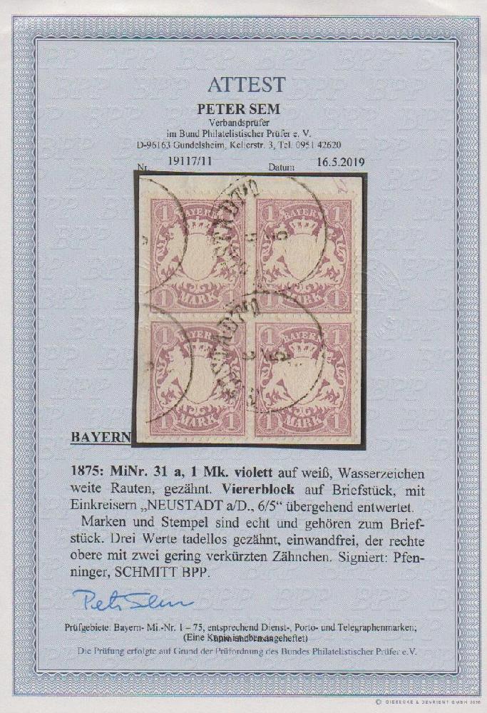 | Zusatzinformationen und Suchstichworte: | Rauhut & Kruschel - 213. Auktion 16. - 17. September 2022 Los 55 Altdeutschland Bayern 1 Mk. violett, seltener, postalisch gebrauchter Viererblock auf Prachtbriefstück mit K1 von Neustadt a.D., alle Zähne vorhanden, lediglich bei der rechten oberen Marken zwei Zahnspitzen gering verkürzt. Gut sign. Schmitt, Pfenninger und Attest Sem. Mi. 1200,- Ausruf 400,00 EUR |
