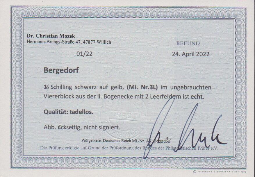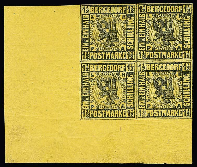 | Zusatzinformationen und Suchstichworte: | Rauhut & Kruschel - 213. Auktion 16. - 17. September 2022 Los 1417 Altdeutschland Bergedorf 1 1/2 Sch. schw./gelb, ungebrauchter Kabinett-Viererblock aus der linken unteren Bogenecke mit zwei Leerfeldern, Fotoexp. Mozek. Mi. lose 400,- ++ Ausruf 120,00 EUR |