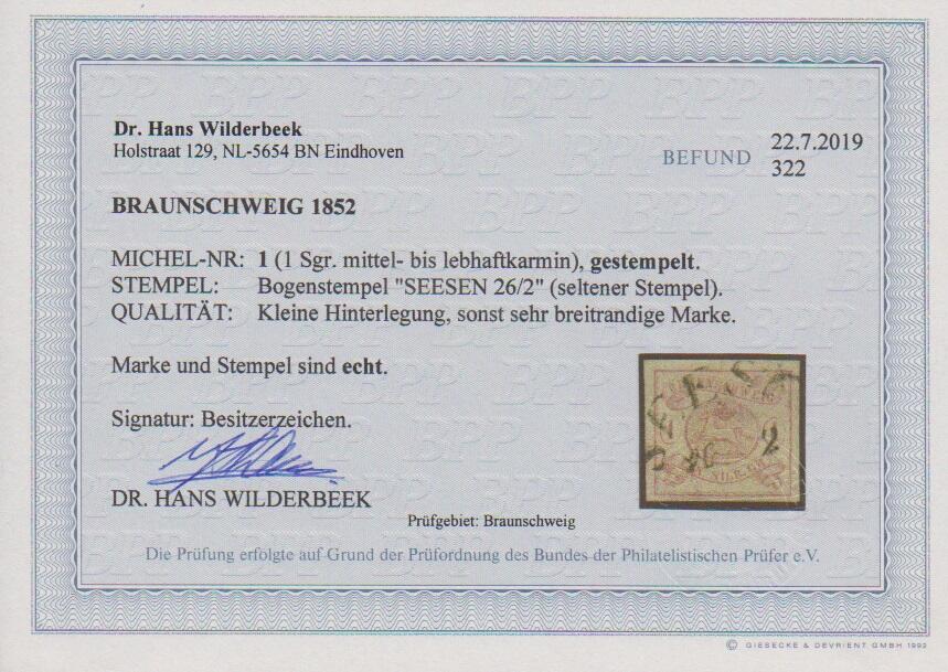 | Zusatzinformationen und Suchstichworte: | Rauhut & Kruschel - 213. Auktion 16. - 17. September 2022 Los 71 Altdeutschland Braunschweig 1 Sgr. lilarosa und 3 Sgr. orangerot, jeweils breitrandig (einmal kl. Hinterlegung), je mit seltener Entwertung durch schwarzen HK "Seesen", eine Fotoexp. Wilderbeek Ausruf 180,00 EUR |
