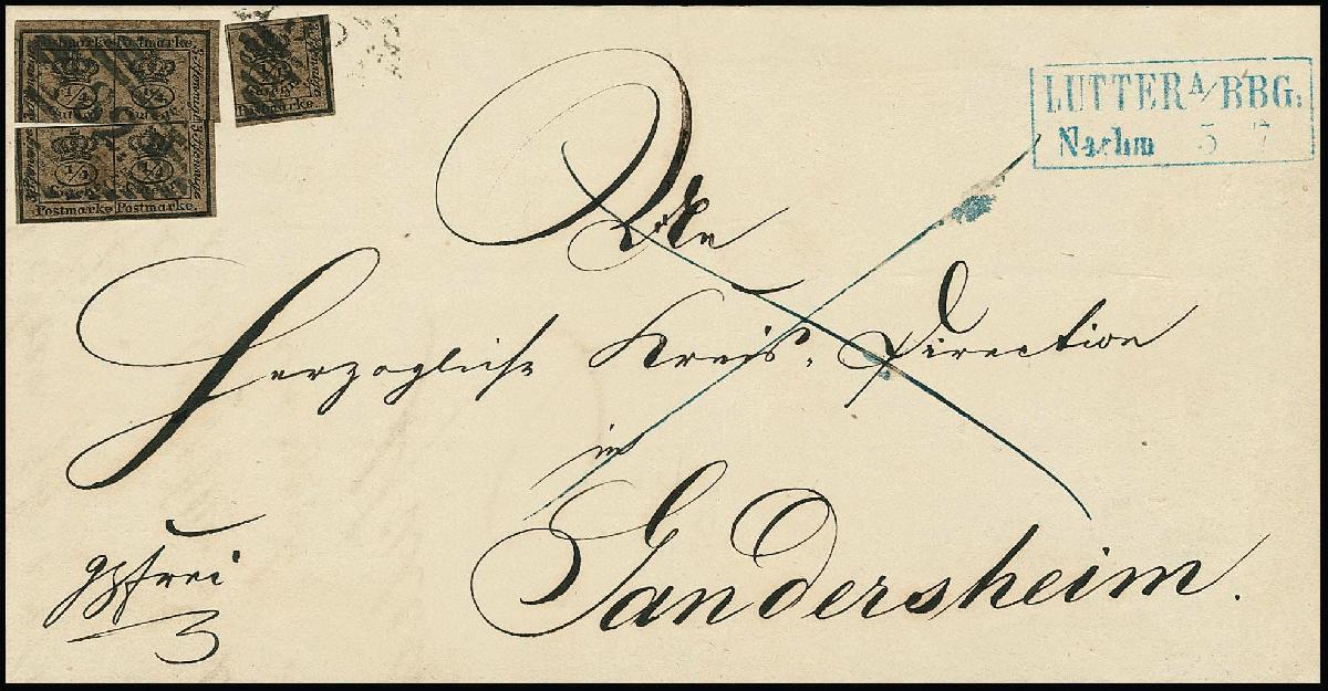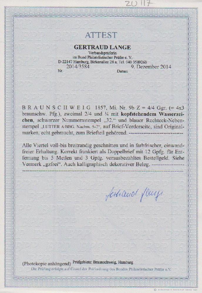 | Zusatzinformationen und Suchstichworte: | Rauhut & Kruschel - 213. Auktion 16. - 17. September 2022 Los 90 Altdeutschland Braunschweig 5/4 Ggr. schw./gelbbraun mit kopfstehendem Wasserzeichen, geklebt zu zweimal 2/4 und einmal 1/4 Ggr., auf tadelloser Briefvs. mit NS "32" und Ra2 "Lutter a. Bbg.". Seltenes Ganzstück mit gleich 5/4 der Nr. 9bZ (Mi. für 4/4 lose gestempelt 2600,-), Attest Lange "in farbfrischer, einwandfreier Erhaltung" Zuschlag 850,00 EUR |