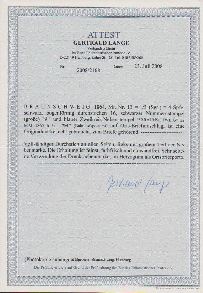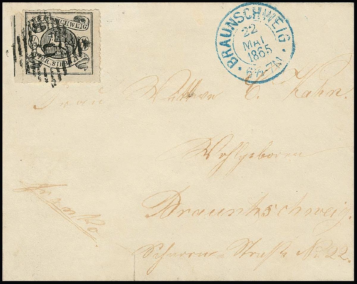 | Zusatzinformationen und Suchstichworte: | Rauhut & Kruschel - 213. Auktion 16. - 17. September 2022 Los 93 Altdeutschland Braunschweig 1/3 Sgr. schwarz als sehr seltene Einzelfrankatur auf Ortsbrief aus Braunschweig (NS "9", große Ziffer, und blauer Neben-K2). Mi. 9000,-, Attest Lange: "vollständiger Durchstich an allen Seiten, links mit großem Teil der Nebenmarke. Die Erhaltung ist feinst, farbfrisch und einwandfrei. Sehr seltene Verwendung der Drucksachenmarke im Herzogthum als Ortsbriefporto." Zuschlag 4.400,00 EUR |