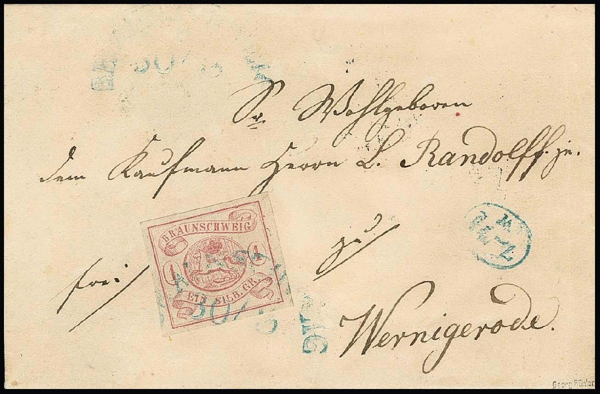 | Zusatzinformationen und Suchstichworte: | Rauhut & Kruschel - 213. Auktion 16. - 17. September 2022 Los 1499 Altdeutschland Braunschweig 1 Sgr. lilarosa, breitrandiges Kabinettstück auf Briefchen mit HK "Braunschweig" 1852 und nebengesetztem Stundenstempel nach Wernigerode. Atteste Lange, Bühler. Mi. 1500,- Zuschlag 370,00 EUR |