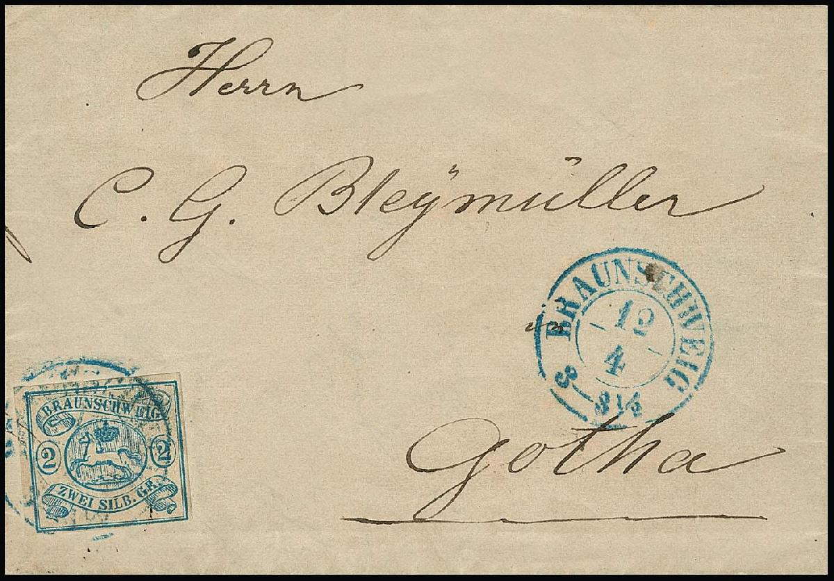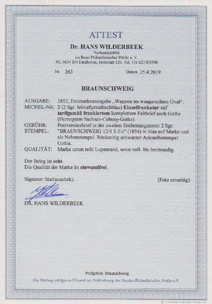 | Zusatzinformationen und Suchstichworte: | Rauhut & Kruschel - 213. Auktion 16. - 17. September 2022 Los 1509 Altdeutschland Braunschweig 2 Sgr. hellblau auf Prachtbrief von Braunschweig (K2) 1854 nach Gotha. Attest Wilderbeek "einwandfrei", Mi. 1200,- Ausruf 300,00 EUR |