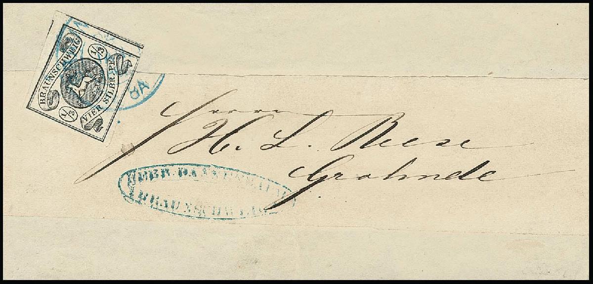 | Zusatzinformationen und Suchstichworte: | Rauhut & Kruschel - 213. Auktion 16. - 17. September 2022 Los 1524 Altdeutschland Braunschweig 1/3 Sgr. schwarz, kleine Stelle rechts unten berührt, sonst voll- bis überrandig, einzeln auf Drucksachen-Schleife von Braunschweig nach Grohnde, Atteste Lange, Grobe. Mi. 3200, Zuschlag 400,00 EUR |
