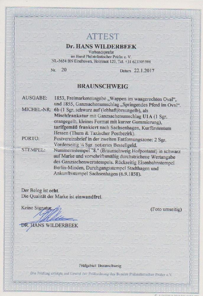 | Zusatzinformationen und Suchstichworte: | Rauhut & Kruschel - 213. Auktion 16. - 17. September 2022 Los 1541 Altdeutschland Braunschweig 1 Sgr. schw./braungelb, tadellos, nur mit NS "8" (Braunschweig Hofpostamt), ohne weiteren Orts-Nebenstempel, auf Ganzsache 1 Sgr. gelborange (leichte Gebrauchsspuren) nach Sachsenhagen 1858. Attest Wilderbeek "einwandfrei" Ausruf 150,00 EUR |