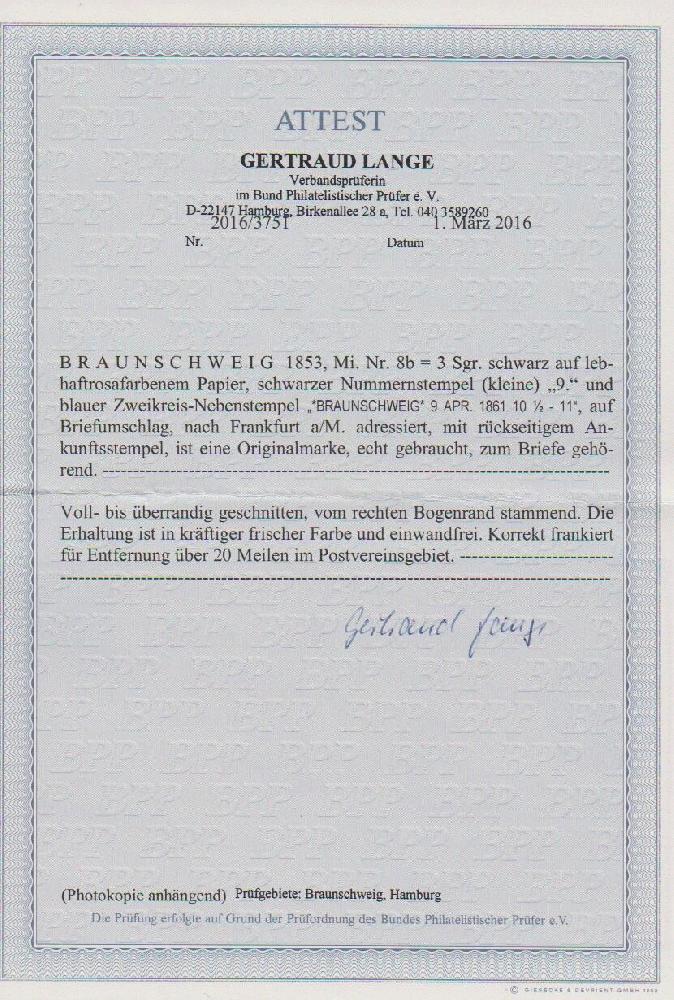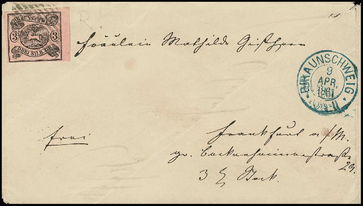 | Zusatzinformationen und Suchstichworte: | Rauhut & Kruschel - 213. Auktion 16. - 17. September 2022 Los 1559 Altdeutschland Braunschweig 3 Sgr. schw./lebhaftrosa, rechtes Kabinett-Randstück auf Postvereinsbrief (nur im Briefpapier zwei leichte schräge Falten) von Braunschweig (NS "9", kleine Type) 1861 nach Frankfurt, Attest Lange. Mi. 700,- Ausruf 180,00 EUR |