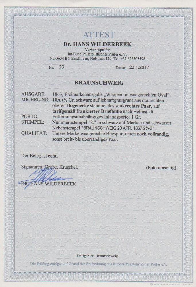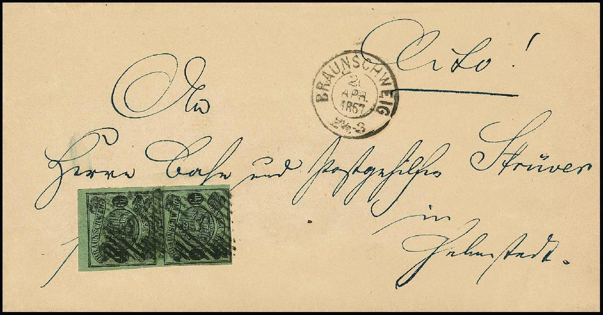 | Zusatzinformationen und Suchstichworte: | Rauhut & Kruschel - 213. Auktion 16. - 17. September 2022 Los 1573 Altdeutschland Braunschweig 1/2 Gr. schw./grün im Paar aus der rechten oberen Bogenecke (!), allseits voll-, meist sehr breitrandig, untere Marke bereits mit leichter Bugspur aufgeklebt, auf dekorativ blau adressiertem Brief von Braunschweig an den Postgehilfen Strüver in Helmstedt. Sign. Grobe, Kruschel (29. Auktion 1989) und Attest Wilderbeek. Mi. 1500,- Zuschlag 300,00 EUR |