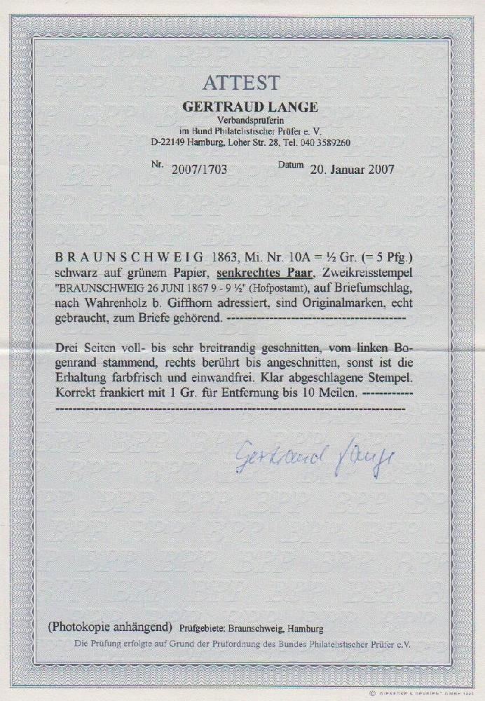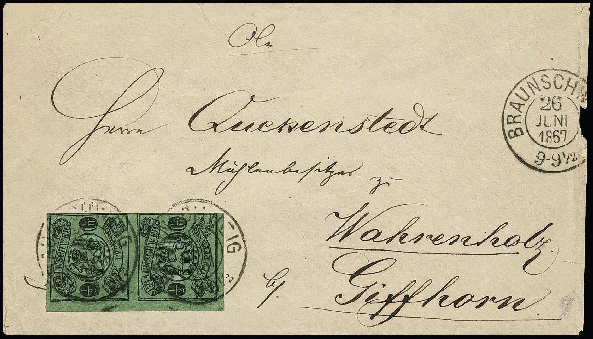 | Zusatzinformationen und Suchstichworte: | Rauhut & Kruschel - 213. Auktion 16. - 17. September 2022 Los 1574 Altdeutschland Braunschweig 1/2 Gr. schw./grün, senkrechtes Paar, rechts berührt, sonst teils sehr breitrandig, auf Couvert 1867 mit K2 "Braunschweig" nach Wahrenholz bei Gifhorn, Attest Lange. Mi. 1500,- Ausruf 200,00 EUR |