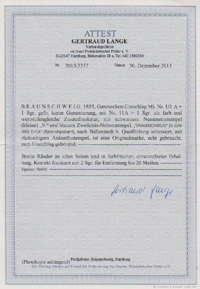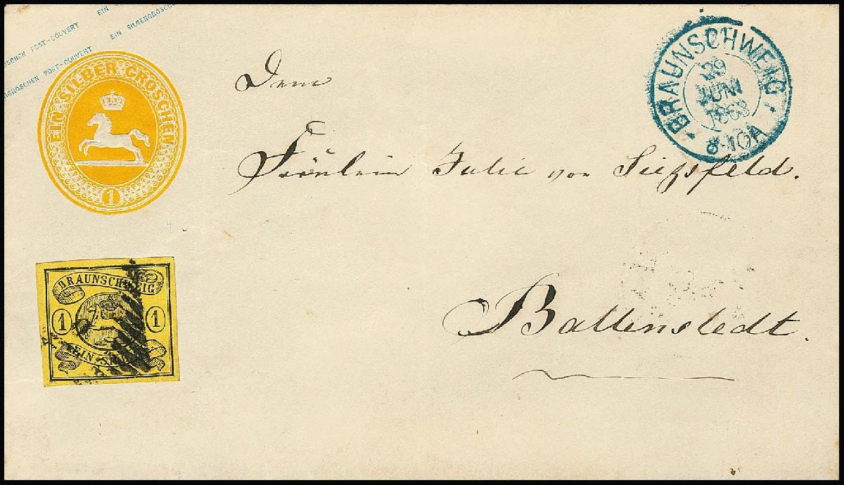 | Zusatzinformationen und Suchstichworte: | Rauhut & Kruschel - 213. Auktion 16. - 17. September 2022 Los 1584 Altdeutschland Braunschweig 1 Sgr. schw./gelb, Kabinettstück auf wertgleicher Ganzsache 1 Sgr. orangegelb, mit NS "8" und K2 "Braunschweig" 1863 nach Ballenstedt. Couvert leichte Gebrauchsspuren (zarte Mittelfalte), lt. Attest Lange "in farbfrischer, einwandfreier Erhaltung" Zuschlag 200,00 EUR |