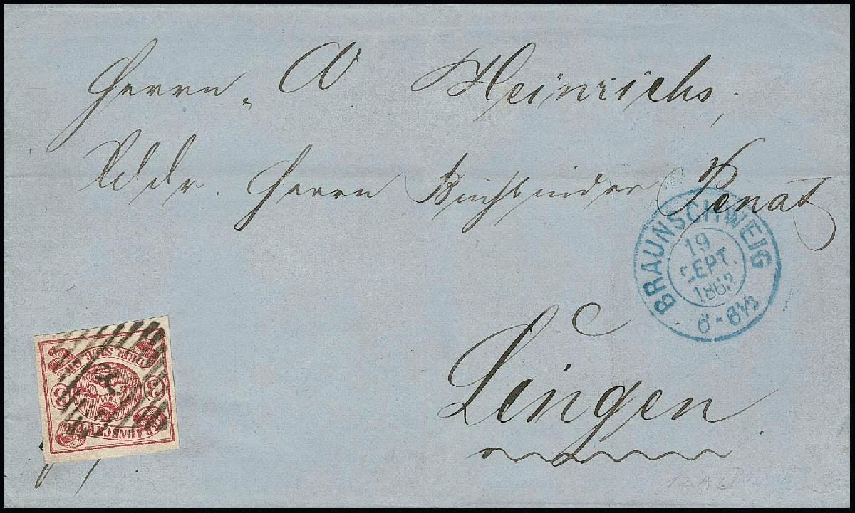 | Zusatzinformationen und Suchstichworte: | Rauhut & Kruschel - 213. Auktion 16. - 17. September 2022 Los 1589 Altdeutschland Braunschweig 3 Sgr. tiefrosa, zentrisch gestempeltes Kabinettstück (NS "8") auf Faltbrief von Braunschweig nach Lingen. Mi. 600,-, Attest Lange, dazu Brief mit Nr. 12Ab (kleine Papiermgl.), Mi. weitere 700,- Zuschlag 220,00 EUR |