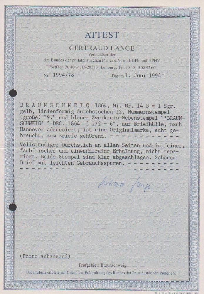 | Zusatzinformationen und Suchstichworte: | Rauhut & Kruschel - 213. Auktion 16. - 17. September 2022 Los 1596 Altdeutschland Braunschweig 1 Sgr. gelbocker, guter linienförmiger Durchstich, auf gef. Prachtbrief von Braunschweig (NS "9") nach Hannover. Attest Lange "in farbfrischer und einwandfreier Erhaltung". Mi. 1200,- Ausruf 280,00 EUR |