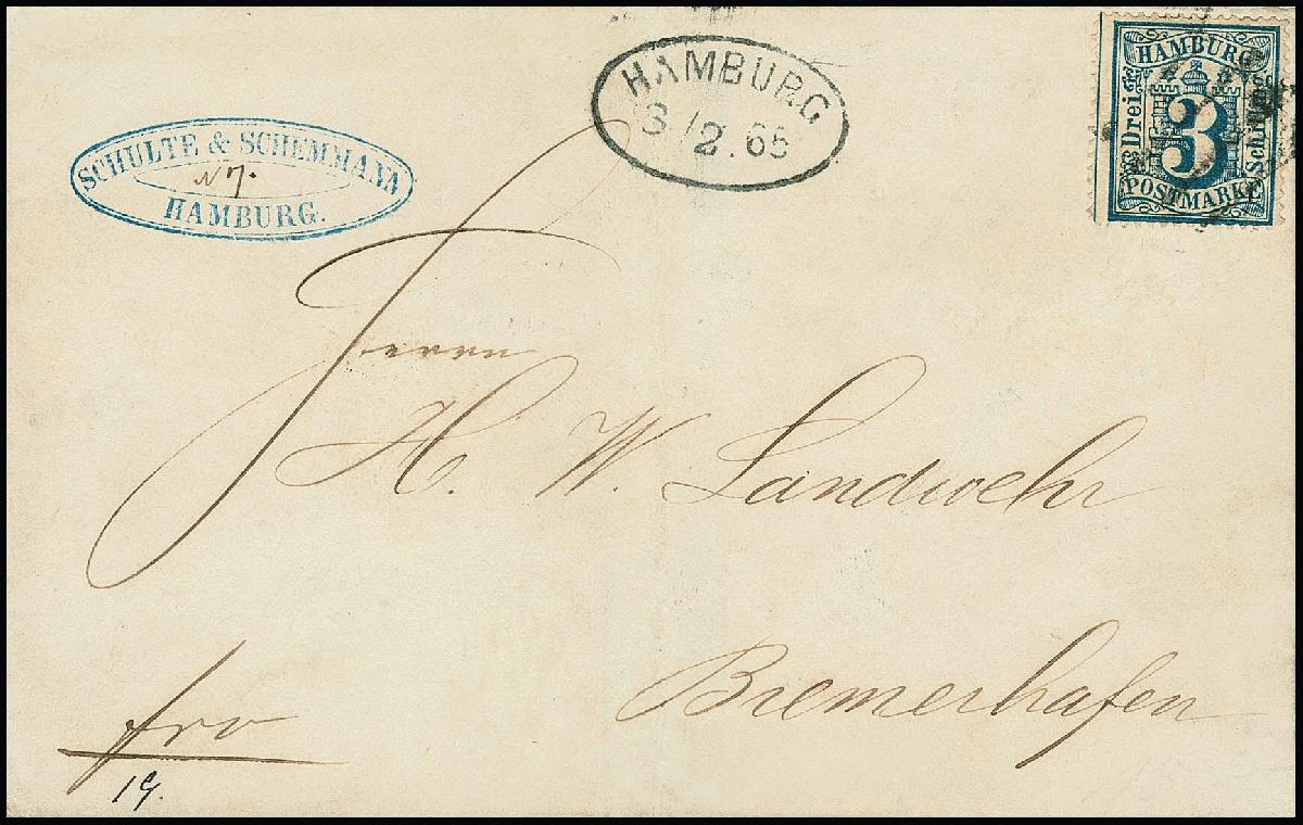 | Zusatzinformationen und Suchstichworte: | Rauhut & Kruschel - 213. Auktion 16. - 17. September 2022 Los 1748 Altdeutschland Hamburg 3 Sch. preußischblau bzw. ultramarinblau je einzeln auf zwei Briefen (kl. Mgl.) von Hamburg nach Bremerhafen bzw. Bremen, Nr. 15b (min. Bugspur) Fotoexp. Lange. Mi. 880,- Ausruf 120,00 EUR |