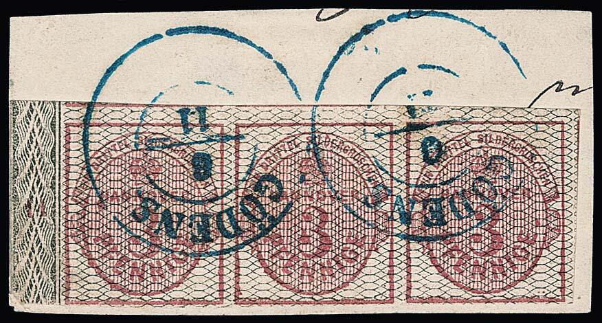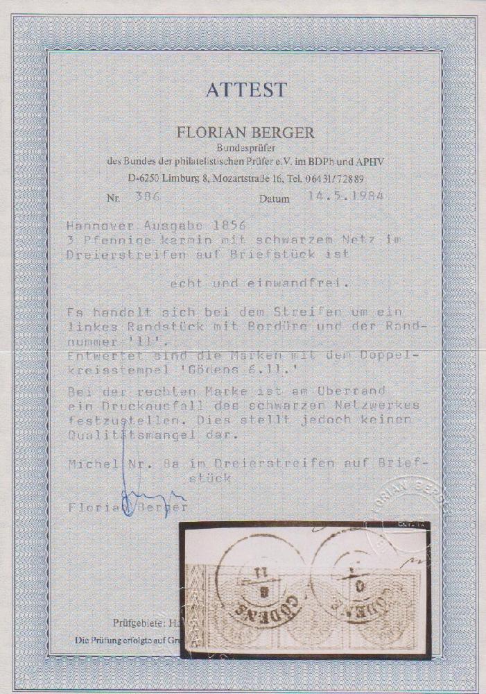 | Zusatzinformationen und Suchstichworte: | Rauhut & Kruschel - 213. Auktion 16. - 17. September 2022 Los 117 Altdeutschland Hannover 3 Pfg. karmin, schwarz genetzt, voll- bis sehr breitrandiger Kabinett-Rand-Dreierstreifen (links Bordüre und Reihenzahl "11", oben und links Nebenmarken) mit klaren K2 "Gödens" auf dekorativem Briefstück, Attest Berger Ausruf 1.000,00 EUR |