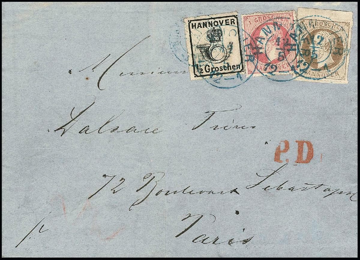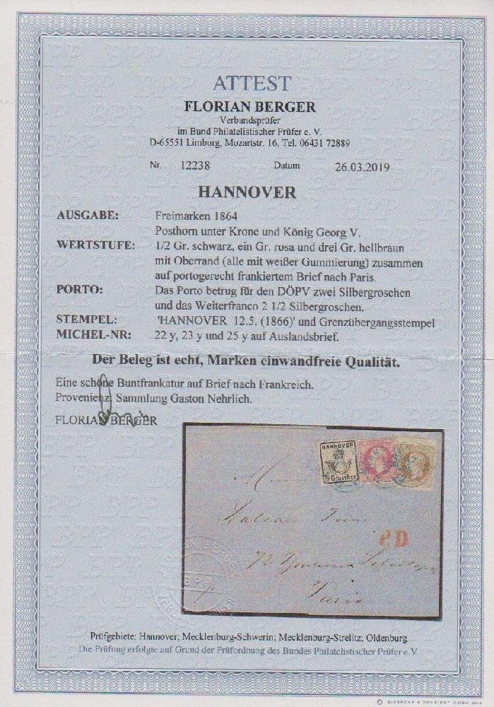 | Zusatzinformationen und Suchstichworte: | Rauhut & Kruschel - 213. Auktion 16. - 17. September 2022 Los 133 Altdeutschland Hannover 1/2 Gr. schwarz, 1 Gr. rosa und Oberrandstück 3 Gr. braun, alle weiße Gummierung, auf gefaltetem Prachtbrief von Hannover 1866 nach Paris. Ex Gaston Nehrlich, Attest Berger "einwandfrei" Zuschlag 880,00 EUR |