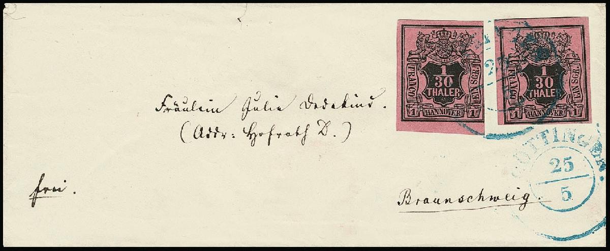 | Zusatzinformationen und Suchstichworte: | Rauhut & Kruschel - 213. Auktion 16. - 17. September 2022 Los 1951 Altdeutschland Hannover 1/30 Th. schw./himbeerrot, zwei Werte mit kopfstehendem Wasserzeichen, die rechte Marke tadellos, die linke rechts berührt, auf Damencouvert aus Göttingen. Möglicherweise die einzige Mehrfach-Frankatur mit der Nr. 3bW. Attest Berger Ausruf 300,00 EUR |