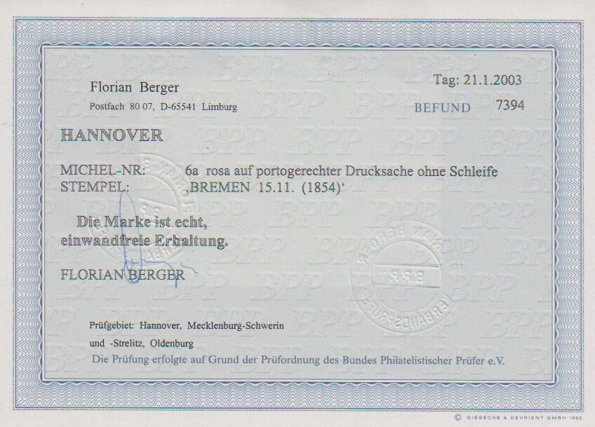 | Zusatzinformationen und Suchstichworte: | Rauhut & Kruschel - 213. Auktion 16. - 17. September 2022 Los 1967 Altdeutschland Hannover 3 Pfge. rosa, voll- bis breitrandiges Kabinettstück mit K1 "Bremen" auf Drucksache (ohne Schleife) 1854, Fotoexp. Berger. Mi. 900,- Ausruf 200,00 EUR |