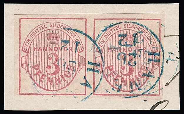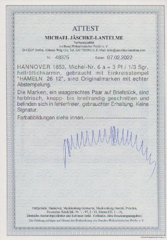 | Zusatzinformationen und Suchstichworte: | Rauhut & Kruschel - 213. Auktion 16. - 17. September 2022 Los 1969 Altdeutschland Hannover 3 Pfg. rosa, voll- bis breitrandiges waager. Paar auf Kabinettbriefstück mit K1 "Hameln", Attest Jäschke-L. Mi. 1000,- Ausruf 300,00 EUR |