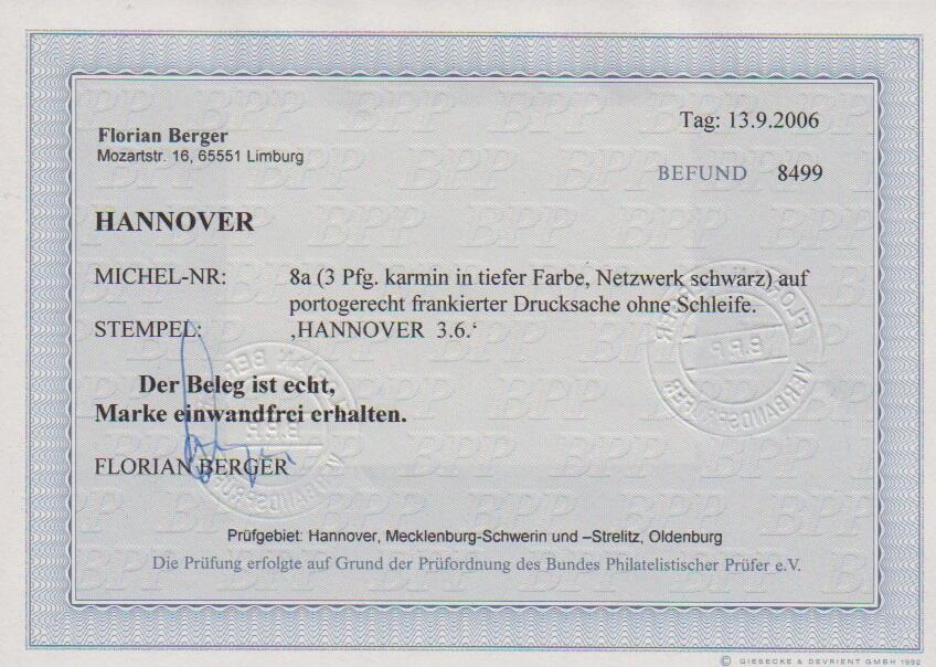 | Zusatzinformationen und Suchstichworte: | Rauhut & Kruschel - 213. Auktion 16. - 17. September 2022 Los 1979 Altdeutschland Hannover 3 Pfge. karmin, schwarz genetzt, farbtiefes Kabinettstück auf Drucksache (ohne Schleife) mit K2 "Hannover", Fotoexp. Berger. Mi. 650,- Ausruf 150,00 EUR |