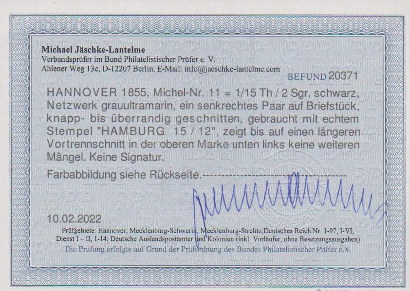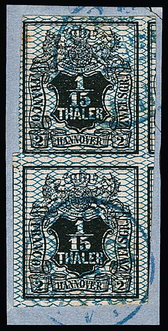 | Zusatzinformationen und Suchstichworte: | Rauhut & Kruschel - 213. Auktion 16. - 17. September 2022 Los 2005 Altdeutschland Hannover 1/15 Th. schw./blau, breitrandiges senkr. Paar (eine Marke Vortrennschnitt, rechts Nebenmarken), Fotoexp. Jäschke-L Ausruf 100,00 EUR |