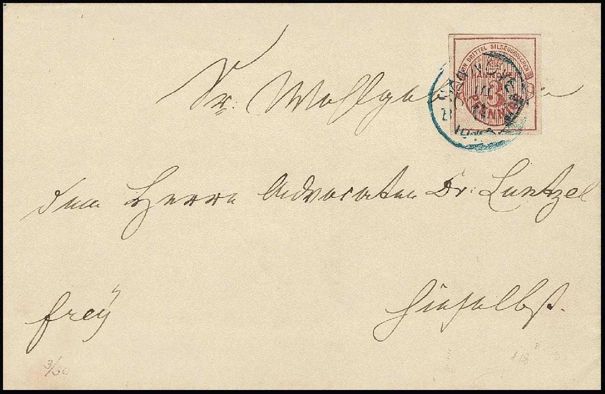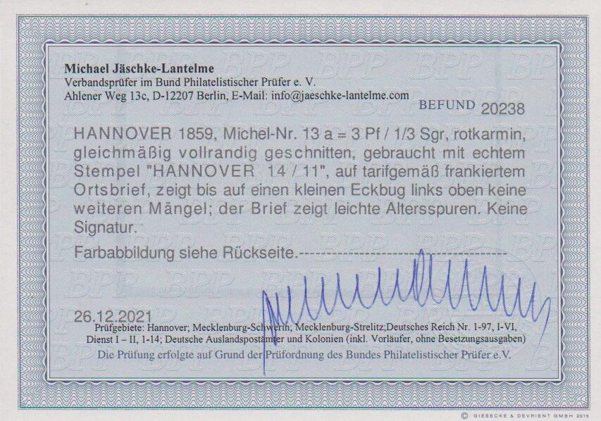 | Zusatzinformationen und Suchstichworte: | Rauhut & Kruschel - 213. Auktion 16. - 17. September 2022 Los 2009 Altdeutschland Hannover 3 Pfg. karminrosa, breitrandig (kl. Eckbug), auf Ortsbrief mit K2 "Hannover", Fotoexp. Jäschke-L Ausruf 120,00 EUR |