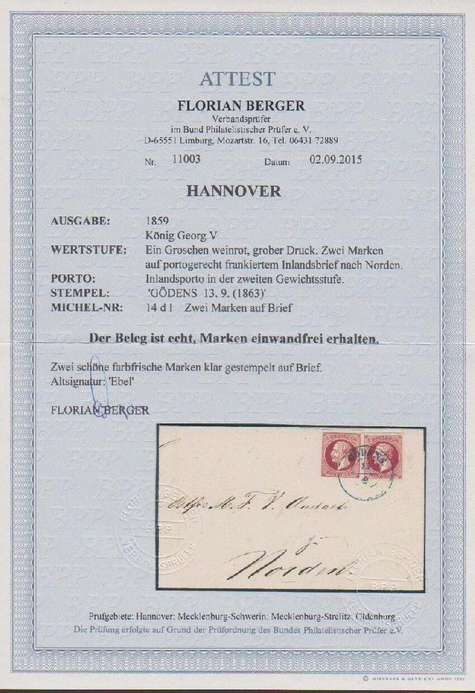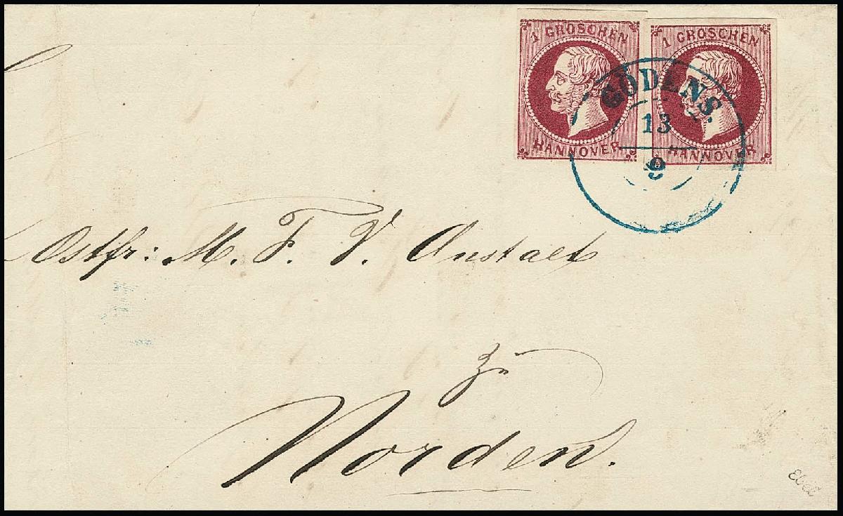 | Zusatzinformationen und Suchstichworte: | Rauhut & Kruschel - 213. Auktion 16. - 17. September 2022 Los 2039 Altdeutschland Hannover 1 Gr. weinrot, grober Druck, per zwei auf Kabinettbrief von Gödens (K2) nach Norden, Attest Berger. Mi. 350,- + Ausruf 150,00 EUR |