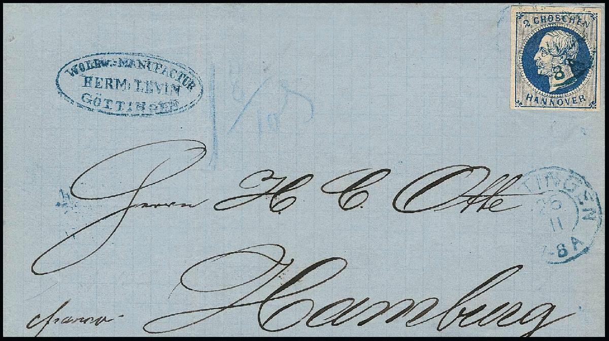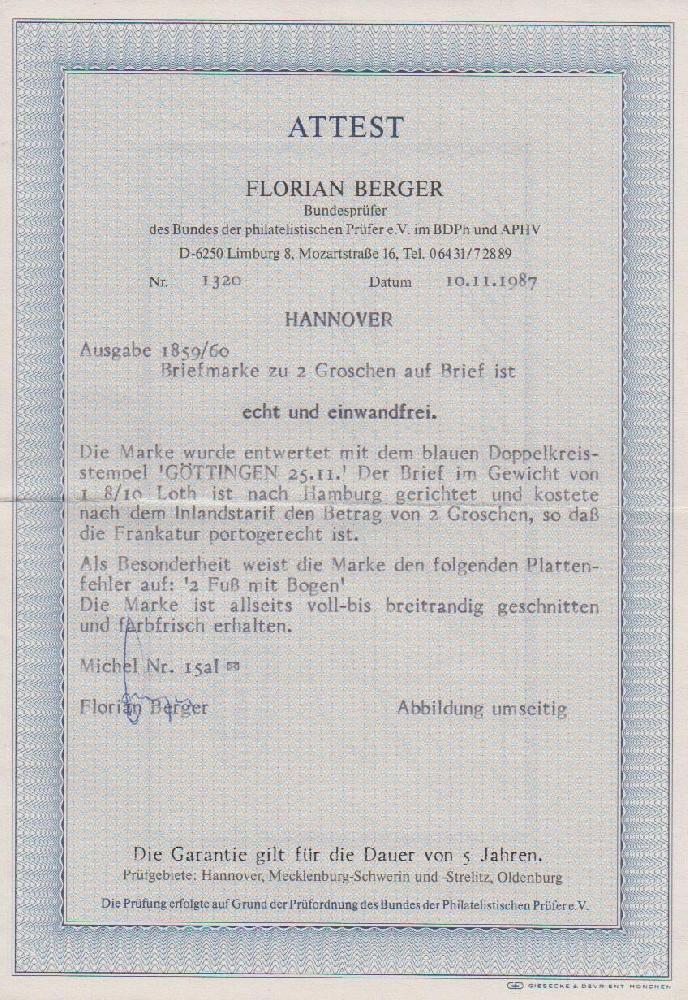 | Zusatzinformationen und Suchstichworte: | Rauhut & Kruschel - 213. Auktion 16. - 17. September 2022 Los 2056 Altdeutschland Hannover 2 Gr. blau, Plattenfehler "geschwungene 2", tadellos, auf Doppelbrief von Göttingen nach Hamburg. Mi. 1400,-, Attest Berger "einwandfrei" Ausruf 350,00 EUR |
