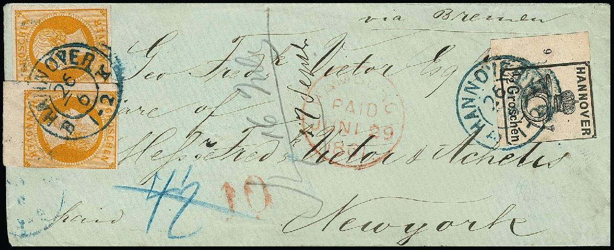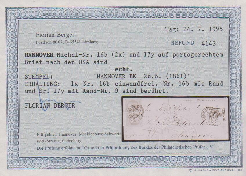 | Zusatzinformationen und Suchstichworte: | Rauhut & Kruschel - 213. Auktion 16. - 17. September 2022 Los 2072 Altdeutschland Hannover 3 Gr. dunkelorange per zwei (einmal vom Unterrand), nebst linkem Randstück 1/2 Gr. schwarz, Reihenzahl "9", auf mintgrünem Damencouvert von Hannover 1861 nach New York. Zwei Marken berührt, Fotoexp. Berger Zuschlag 260,00 EUR |