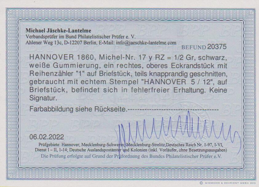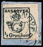 | Zusatzinformationen und Suchstichworte: | Rauhut & Kruschel - 213. Auktion 16. - 17. September 2022 Los 2078 Altdeutschland Hannover 1/2 Gr. schwarz, weiße Gummierung, voll- bis breitrandige Bogenecke (rechts Reihenzahl "1") auf Kabinettbriefstück mit K2 "Hannover", Fotoexp. Jäschke-L Ausruf 200,00 EUR |
