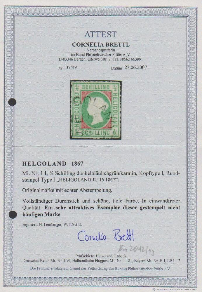 | Zusatzinformationen und Suchstichworte: | Rauhut & Kruschel - 213. Auktion 16. - 17. September 2022 Los 135 Altdeutschland Helgoland 1 Sch. bläulichgrün/karmin, Kopftype I, Kabinettstück mit klarem Rundstempel "Heligoland" aus Juni 1867. Diese schwierige Marke ist in einwandfreier Erhaltung selten! Sign. Engel, Lemberger und Attest C. Brettl Zuschlag 1.200,00 EUR |