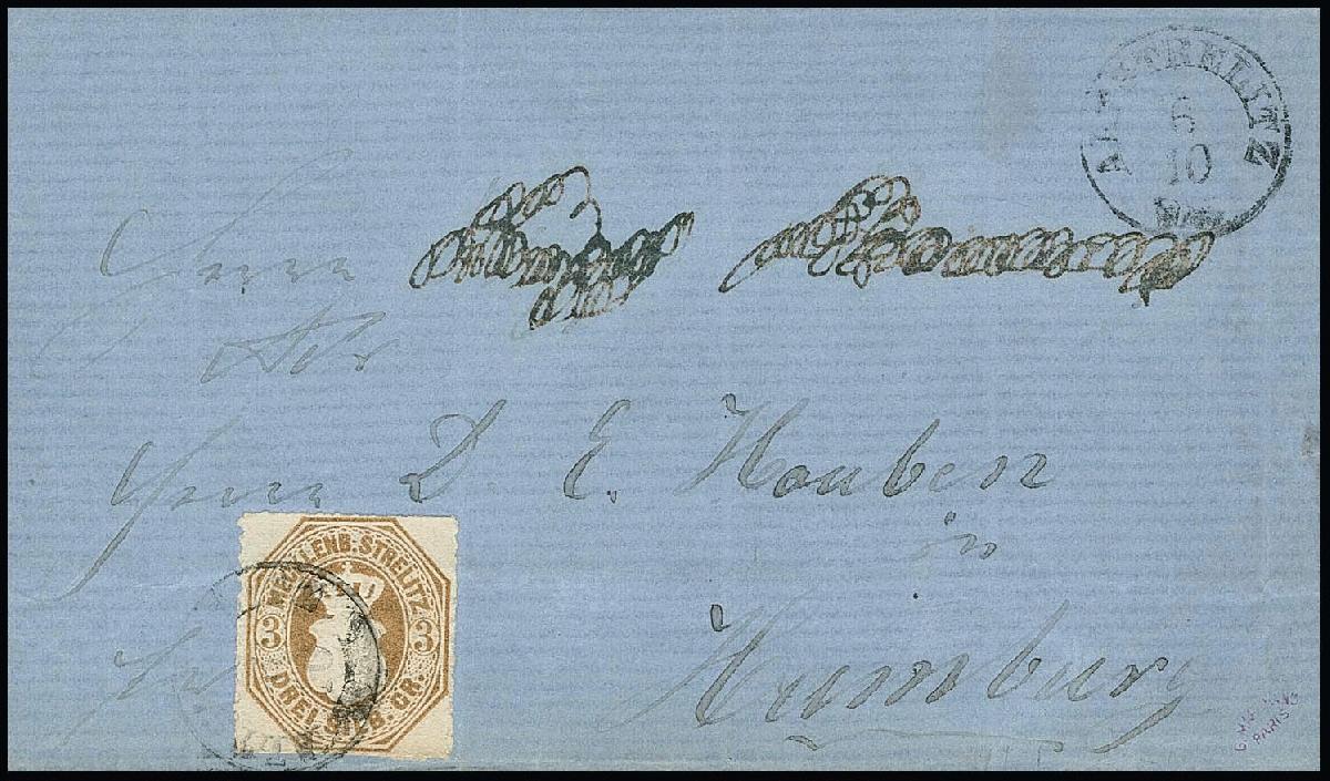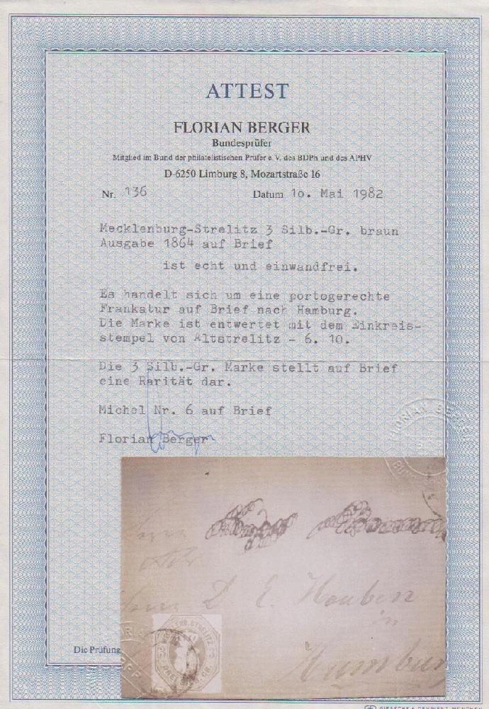 | Zusatzinformationen und Suchstichworte: | Rauhut & Kruschel - 213. Auktion 16. - 17. September 2022 Los 147 Altdeutschland Mecklenburg Strelitz 3 Sgr. ockerbraun, Kabinettstück einzeln auf blauem Faltbrief (Adreßname gestrichen) mit K1 "Altstrelitz" nach Hamburg. Briefe mit dieser Marke sind sehr selten! Attest Berger. Mi. 7500,- Zuschlag 1.350,00 EUR |