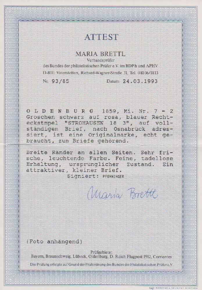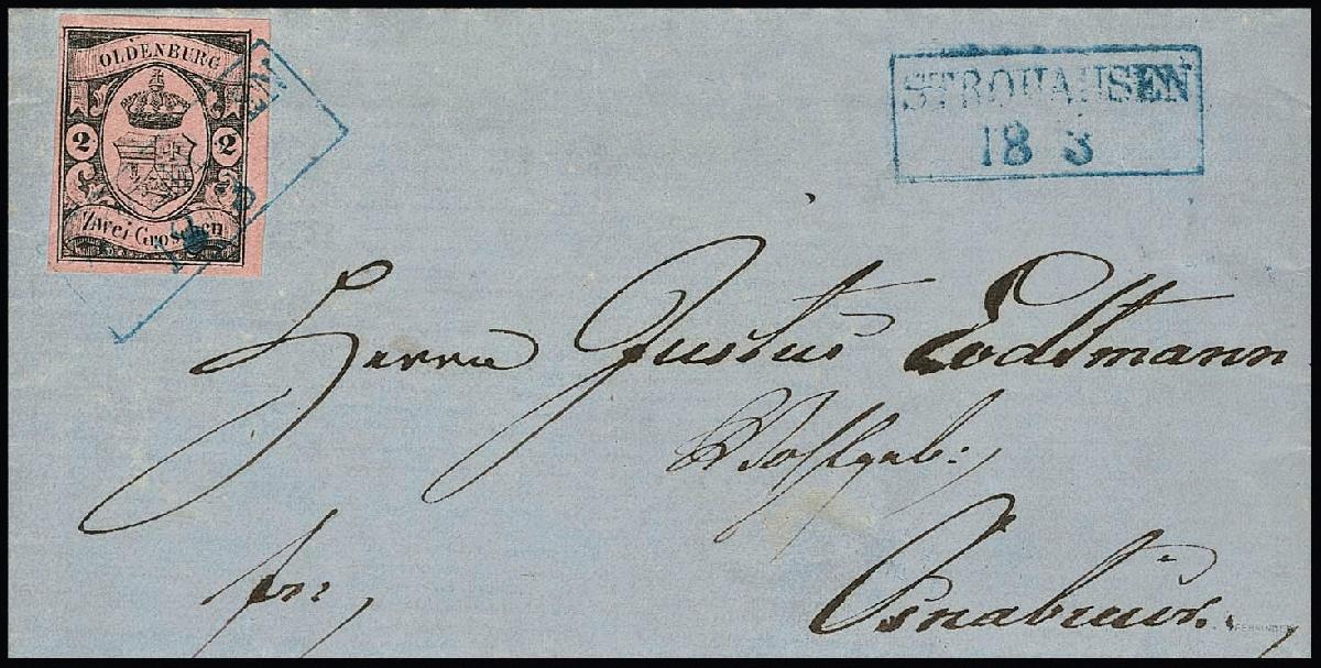 | Zusatzinformationen und Suchstichworte: | Rauhut & Kruschel - 213. Auktion 16. - 17. September 2022 Los 151 Altdeutschland Oldenburg 2 Gr. schw./rosa auf Kabinettbriefchen mit Ra2 "Strohausen" nach Osnabrück, Inhalt aus Hartwarden 1861. Sign. Pfenninger und Attest Brettl. Mi. 3200,- Ausruf 1.500,00 EUR |