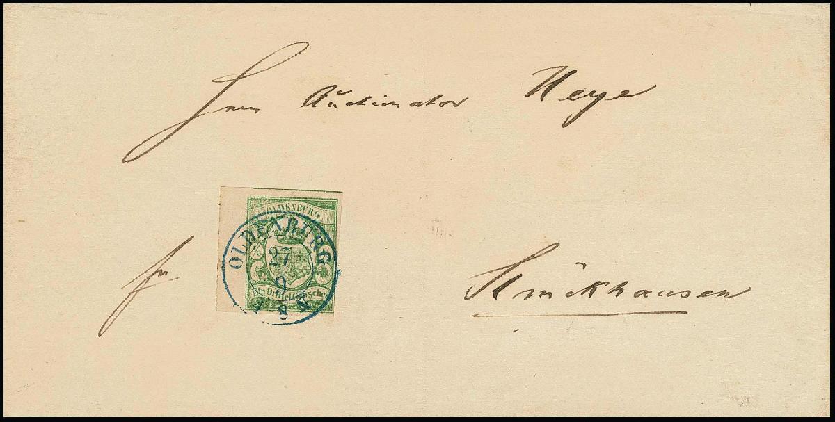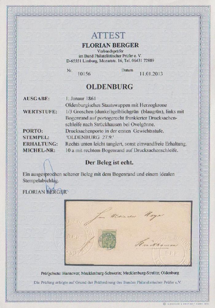 | Zusatzinformationen und Suchstichworte: | Rauhut & Kruschel - 213. Auktion 16. - 17. September 2022 Los 155 Altdeutschland Oldenburg 1/3 Gr. gelblichgrün, links breiter Bogenrand, rechts unten minimal berührt, einzeln mit schön zentrischem K2 "Oldenburg" auf dekorativer Drucksachenschleife nach Struckhausen. Mi. 15.000,-, als Randstück besonders selten! Atteste Engel (als einwandfrei) und Berger Zuschlag 2.700,00 EUR |