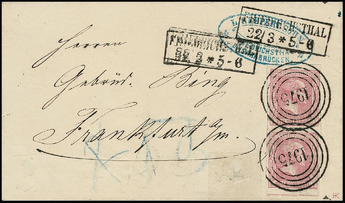 | Zusatzinformationen und Suchstichworte: | Rauhut & Kruschel - 213. Auktion 16. - 17. September 2022 Los 238 Altdeutschland Preussen "1975" nebst zweifachem Ra2 "Friedrichsthal" klar auf Brief mit teils überrandigem Paar 1 Sgr. Gittergrund, nur im Briefpapier zwei Löcher, untere Marke des Paares kleine Kratzspur, im Attest Flemming nicht erwähnt. Auf Brief einer der seltensten Saarland-Nummernstempel, nur wenige Ganzstücke bekannt (lt. Krauß-Handbuch nur zwei Briefe registriert) Zuschlag 900,00 EUR |