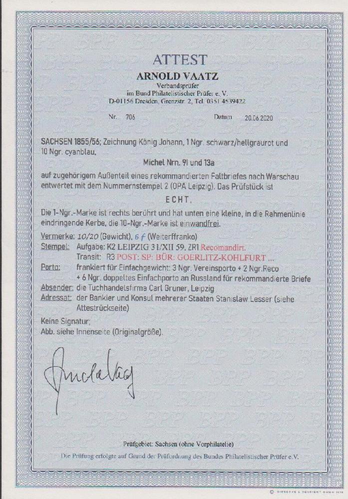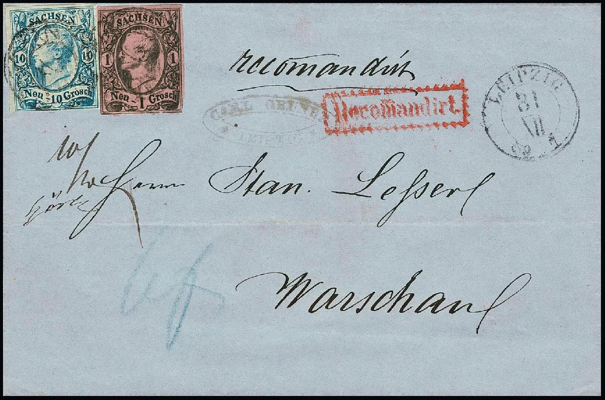 | Zusatzinformationen und Suchstichworte: | Rauhut & Kruschel - 213. Auktion 16. - 17. September 2022 Los 242 Altdeutschland Sachsen 10 Ngr. blau, Kabinettstück nebst winzig berührter 1 Ngr. schw./rosa auf Einschreibebrief von Leipzig 1859 aus der bekannten "Lesser"-Korrespondenz nach Warschau (3 Ngr. Postverein, 2 Ngr. Reco, 6 Ngr. Rußland) Zuschlag 540,00 EUR |