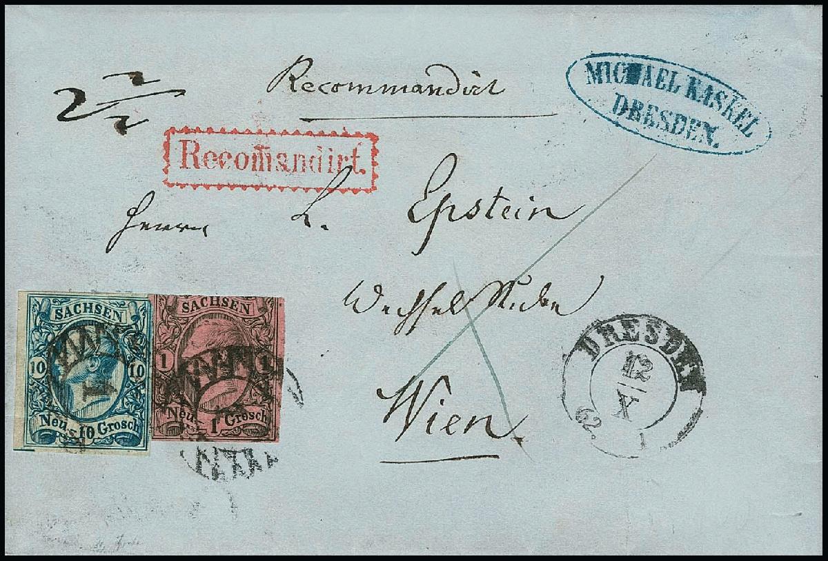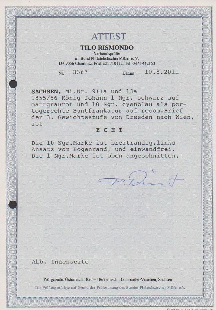 | Zusatzinformationen und Suchstichworte: | Rauhut & Kruschel - 213. Auktion 16. - 17. September 2022 Los 243 Altdeutschland Sachsen 10 Ngr. blau, Kabinettstück vom linken Bogenrand, nebst oben angeschnittener 1 Ngr. schw./rosa, auf sauberem Einschreibebrief aus bekannter Korrespondenz von Dresden 1862 nach Wien. Dritte Gewichtsstufe Postverein (= 9 Ngr.) plus 2 Ngr. Reco. Attest Rismondo. Mi. 1800,- Ausruf 500,00 EUR |