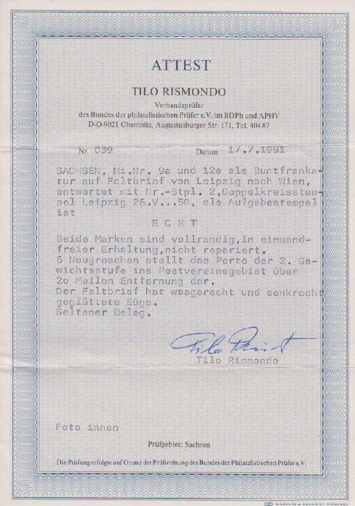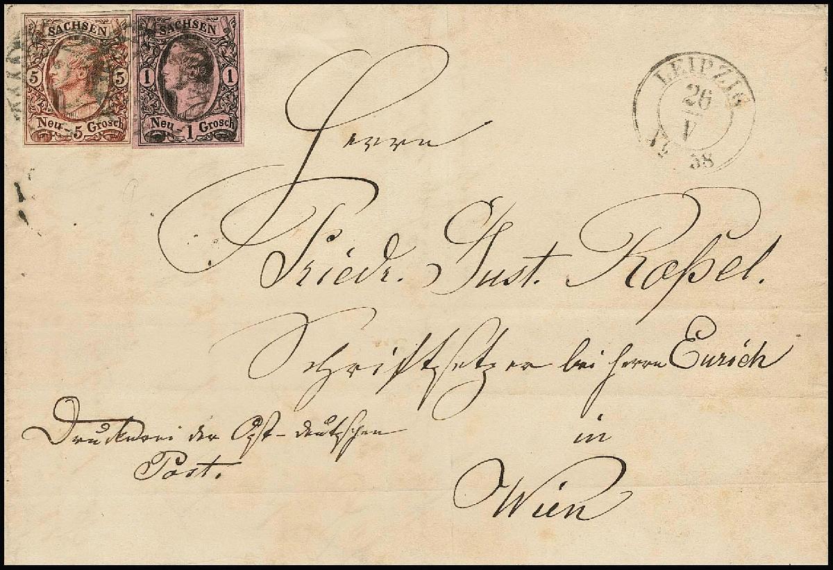 | Zusatzinformationen und Suchstichworte: | Rauhut & Kruschel - 213. Auktion 16. - 17. September 2022 Los 4235 Altdeutschland Sachsen 5 Ngr. rotbraun und 1 Ngr. schw./rosa auf Faltbrief der 2. Gewichtsstufe von Leipzig 1858 nach Wien. Beide Marken einwandfrei, der Brief Falten ausserhalb. Mi. 750,- Zuschlag 195,00 EUR |