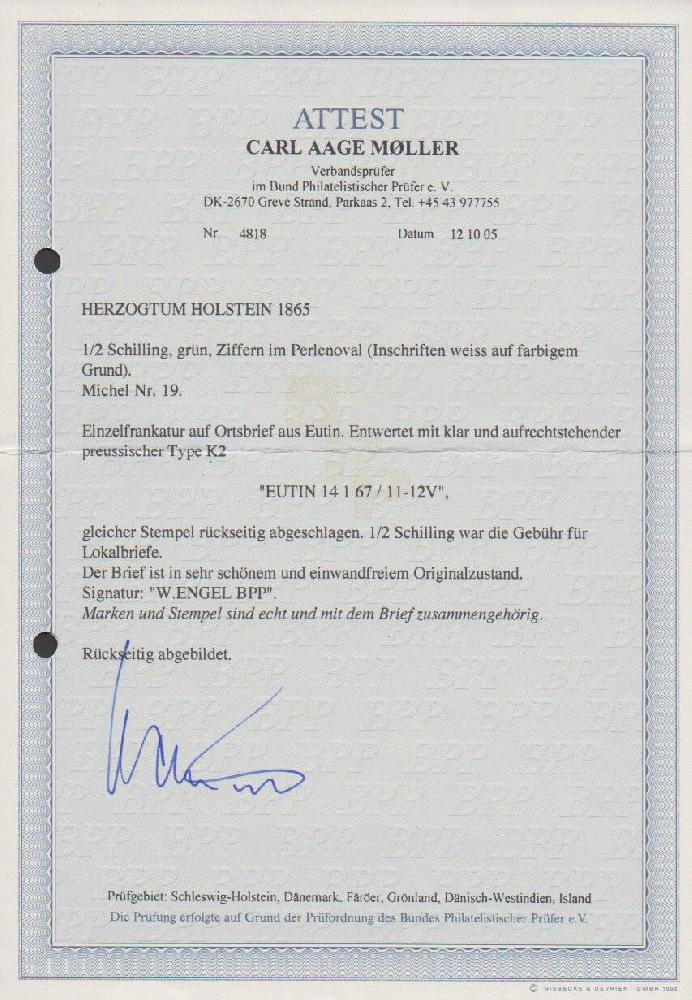 | Zusatzinformationen und Suchstichworte: | Rauhut & Kruschel - 213. Auktion 16. - 17. September 2022 Los 4361 Altdeutschland Schleswig Holstein 1/2 Sch. grün, perfektes Exemplar einzeln auf hübschem kleinem Brief mit K2 "Eutin" in den eigenen Ortsbereich, sign. Engel und Attest Möller. Mi. 400,- Zuschlag 220,00 EUR |