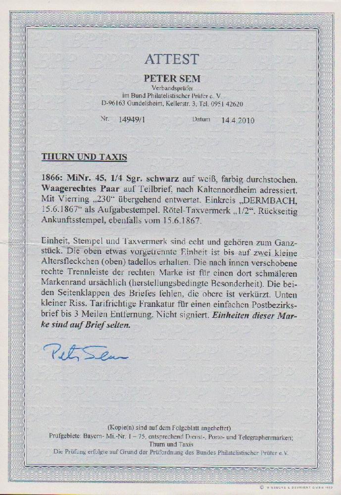 | Zusatzinformationen und Suchstichworte: | Rauhut & Kruschel - 213. Auktion 16. - 17. September 2022 Los 254 Altdeutschland Thurn und Taxis 1/4 Sgr. schwarz, sehr seltenes Paar (oben zwei kleine Fleckchen) mit klarem NS "230" und K1 "Dermbach" auf Brief (dieser rs. Klappenteile etwas verkürzt und kleiner Randriß) nach Kaltennordheim. Paare dieser Marke auf Ganzstücken sind sehr selten! Attest Sem. Mi. 7500,- Ausruf 1.800,00 EUR |