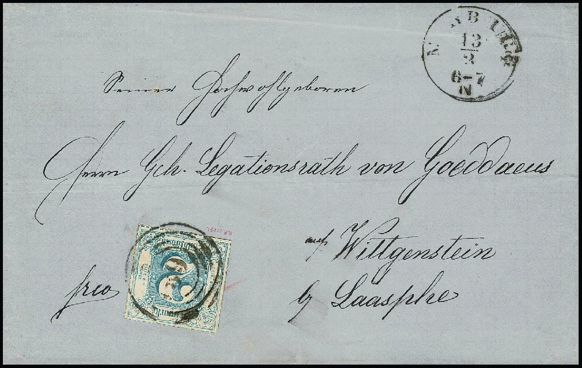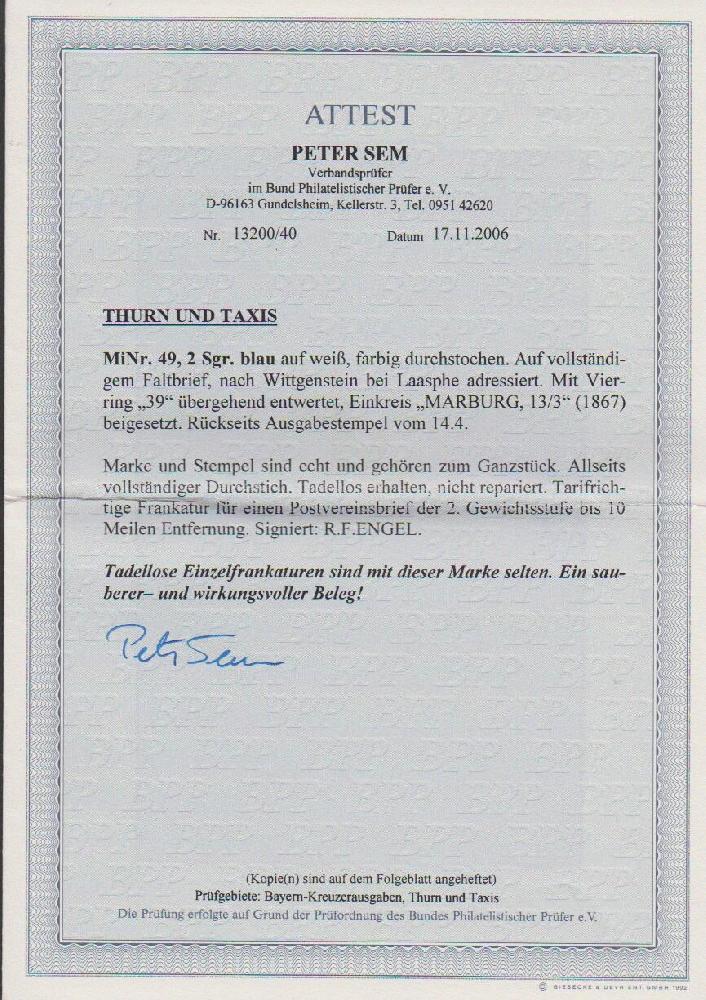 | Zusatzinformationen und Suchstichworte: | Rauhut & Kruschel - 213. Auktion 16. - 17. September 2022 Los 255 Altdeutschland Thurn und Taxis 2 Sgr. blau, farbig durchstochen, einzeln auf Kabinettbrief von Marburg nach Wittgenstein bei Laasphe 1867, sign. R.F. Engel und Attest Sem. Mi. 1600,- Zuschlag 650,00 EUR |