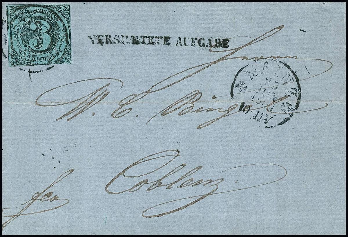 | Zusatzinformationen und Suchstichworte: | Rauhut & Kruschel - 213. Auktion 16. - 17. September 2022 Los 4500 Altdeutschland Thurn und Taxis 3 Kr. schw./bläulichgrün, meist vollrandig, nur rechts unten leicht berührt, auf Brief von Mainz 1857 nach Coblenz mit seltenem Neben-L1 "VERSPAETETE AUFGABE" Ausruf 150,00 EUR |