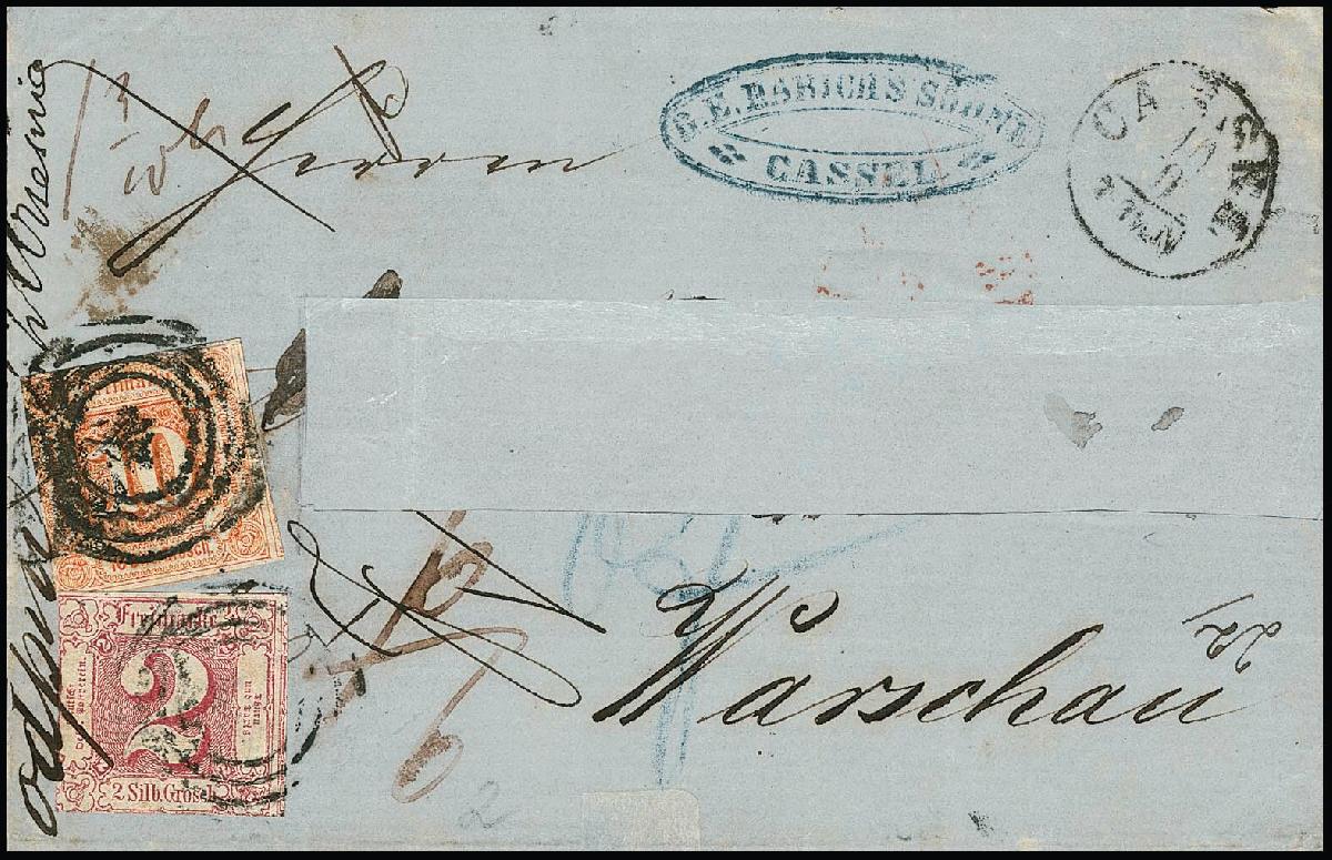 | Zusatzinformationen und Suchstichworte: | Rauhut & Kruschel - 213. Auktion 16. - 17. September 2022 Los 4518 Altdeutschland Thurn und Taxis 10 Sgr. orange, links berührt, nebst 2 Sgr. karmin auf Brief (Adressname ausgeschnitten und hinterklebt, Registraturvermerke) von Cassel 1863 nach Warschau/Russisch-Polen. Seltene Frankatur mit der Nr. 19 (Mi. 3000,-) Ausruf 280,00 EUR |