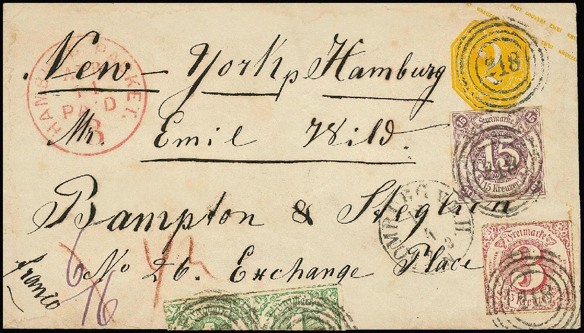 | Zusatzinformationen und Suchstichworte: | Rauhut & Kruschel - 213. Auktion 16. - 17. September 2022 Los 4528 Altdeutschland Thurn und Taxis 15 Kr. purpur, breitrandig und gut, nebst 3 Kr. rosa und um den Rand geklebtes Paar 1 Kr. grün auf Ganzsache 2 Kr. gelb, mit NS "218" und K1 "Homburg v.d.H." nach New York. Couvert Gebrauchserhaltung (rs. Mgl.) Ausruf 350,00 EUR |